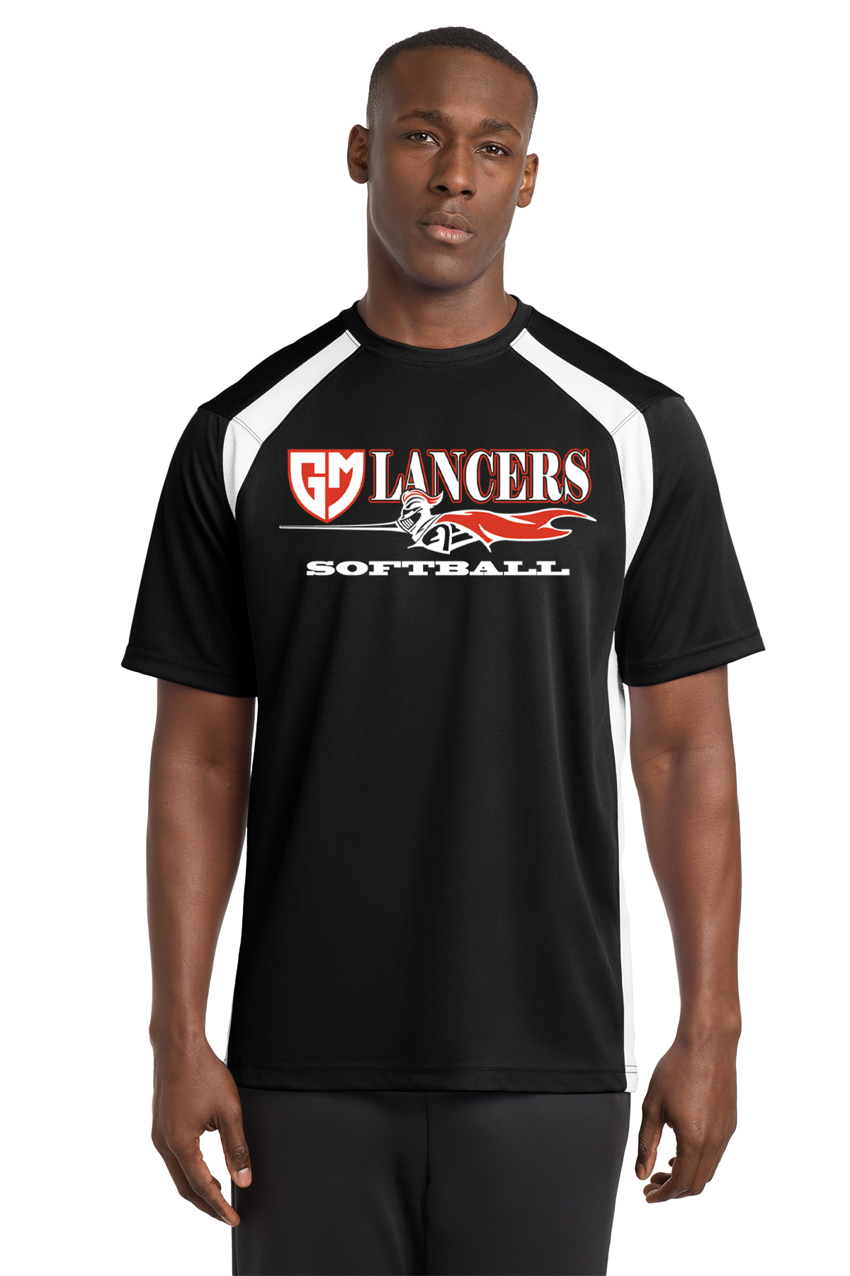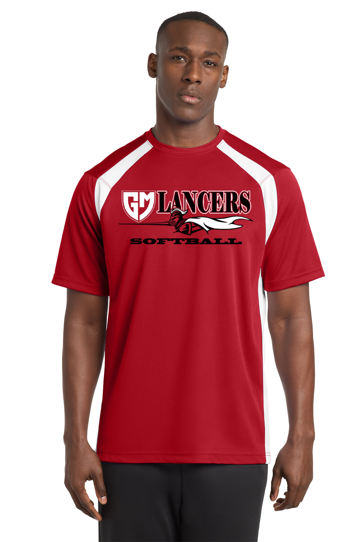 Moisture-wicking, odor-fighting performance with colorblock side panels, raglan sleeves and set-in construction on the back for easy movement.